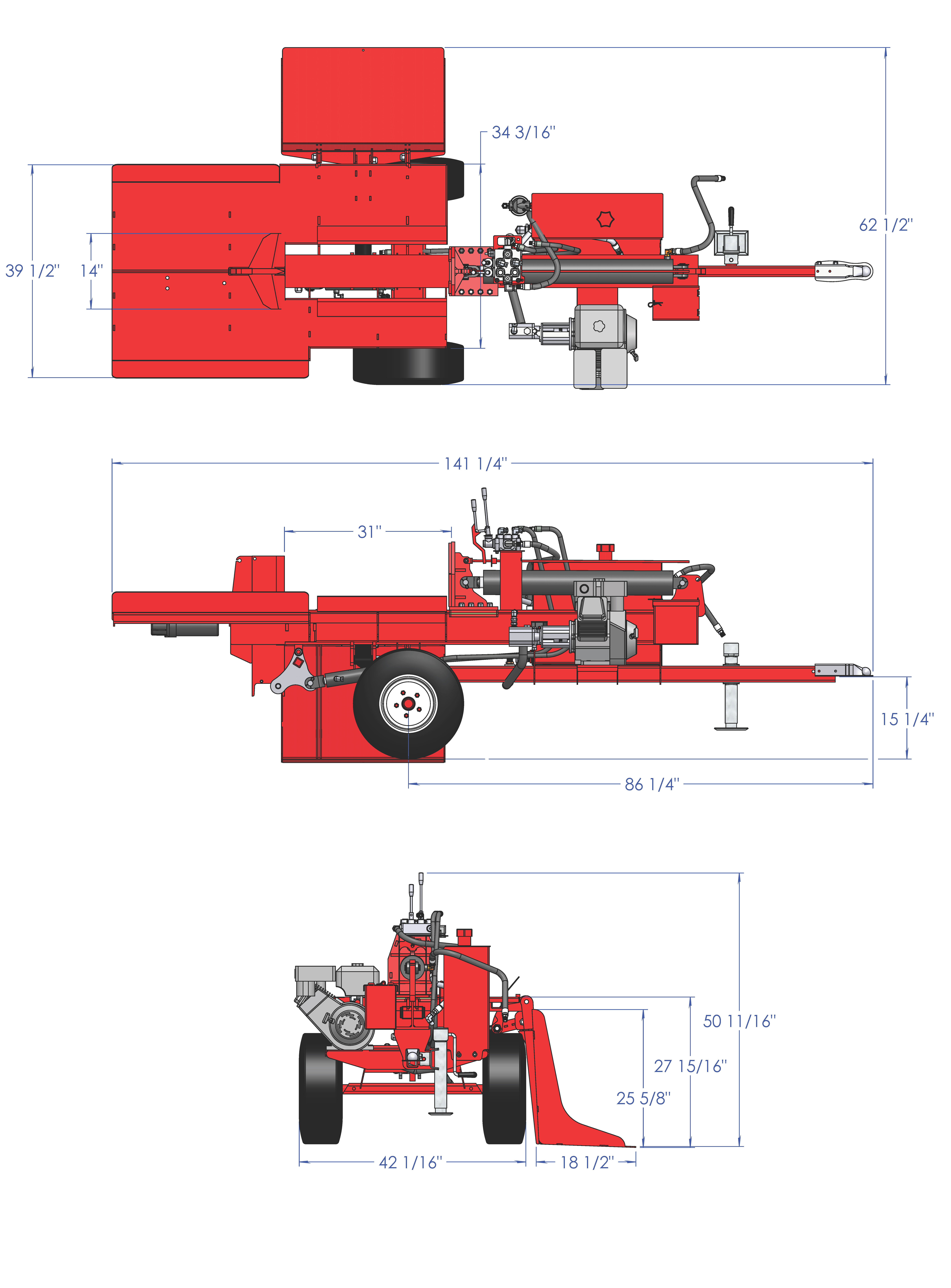 This Woody 40-30 4-Way Wedge Standalone log Splitter model is designed for commercial use. It is equipped with a 9 HP Honda engine, a 13.0/4.2gpm 2 stage pump, a 15 gallon tank, a stroke length of 30”,a Log lifting, a 2” hitch coupler and this splitter is equipped with a lever to adjust the cut to 3 different positions. It can split wood in the horizontal position.