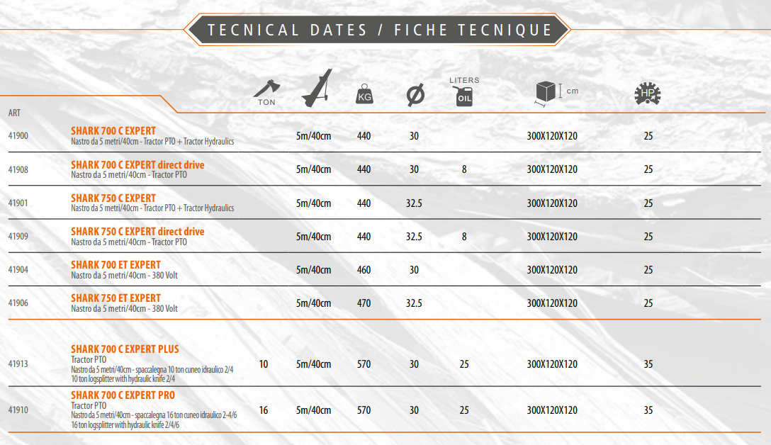 L’extension de la bande est hydraulique, toutes les palettes sont en métal et les pièces de tissu en PVC sont interchangeables. SHARK 700 Expert Plus et SHARK 700 Expert Pro complètent le Shark 700 Expert avec l’ajout de la fendeuse de bûches latérale avec coin hydraulique.