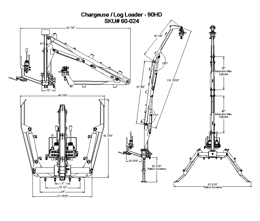 The 90-HD is designed for ATVs of 400 cc and more, and for small tractors. Its 63” low profile is ideal for work in the sugar bush; you are able to go under your tubes in several locations without dismantling. It has a 9’ range and has a 600 lb lifting capacity at maximum range. The 90-HD has its own hydraulic unit, therefore, you do not need an auxiliary oil output.