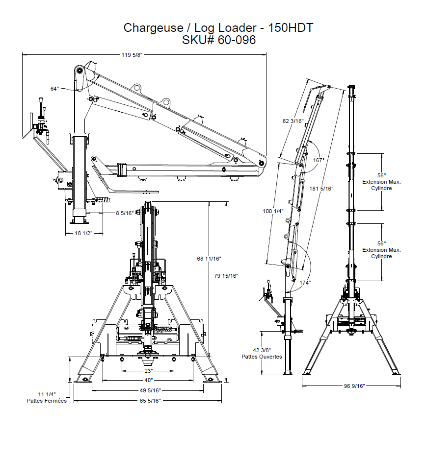 The 150-HDT Telescopic Log Loader model equipped with a 15' boom and a 3’ telescopic hydraulic boom extension makes it ideal for trucks and tractors from 50 HP and more. With its lift capacity that exceeds its competitors, this model is an excellent choice for the most demanding producers.