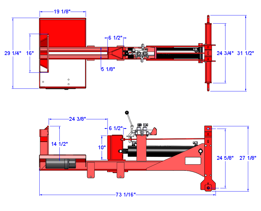 This Woody 3 point Log Splitter is fueled by the tractor’s oil outputs. This 40-24 model can split horizontally and vertically by changing the 3 point clip position. Lengths of 24".