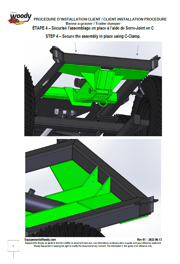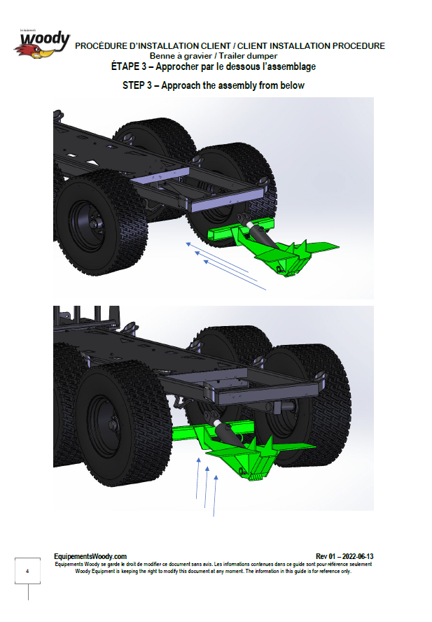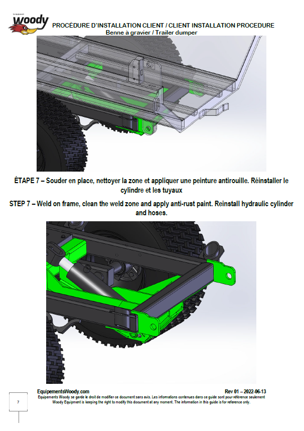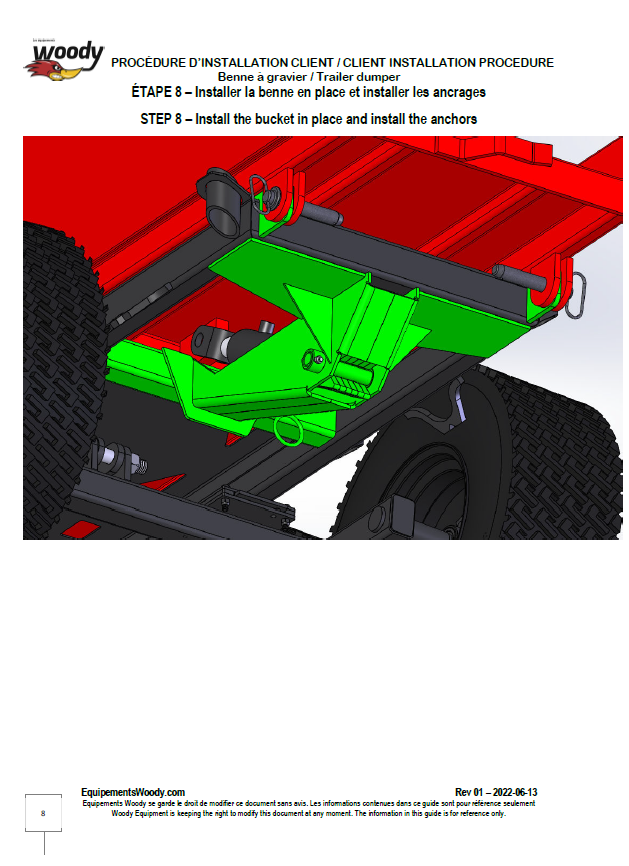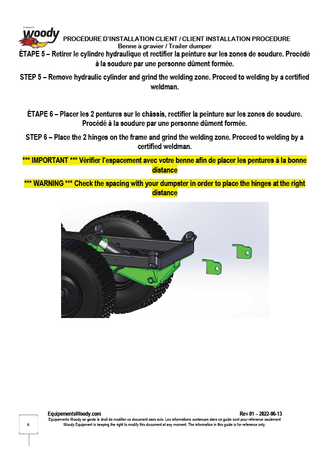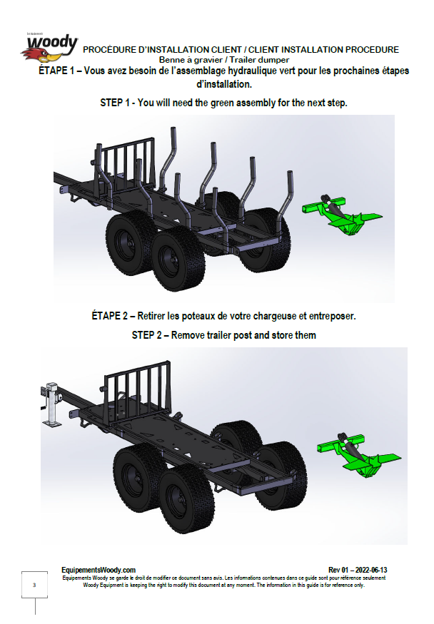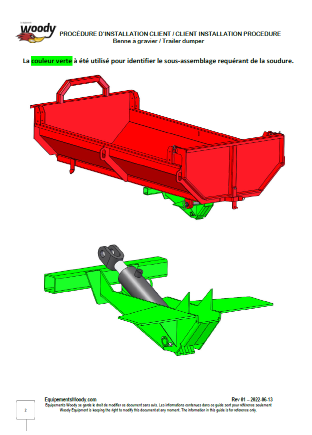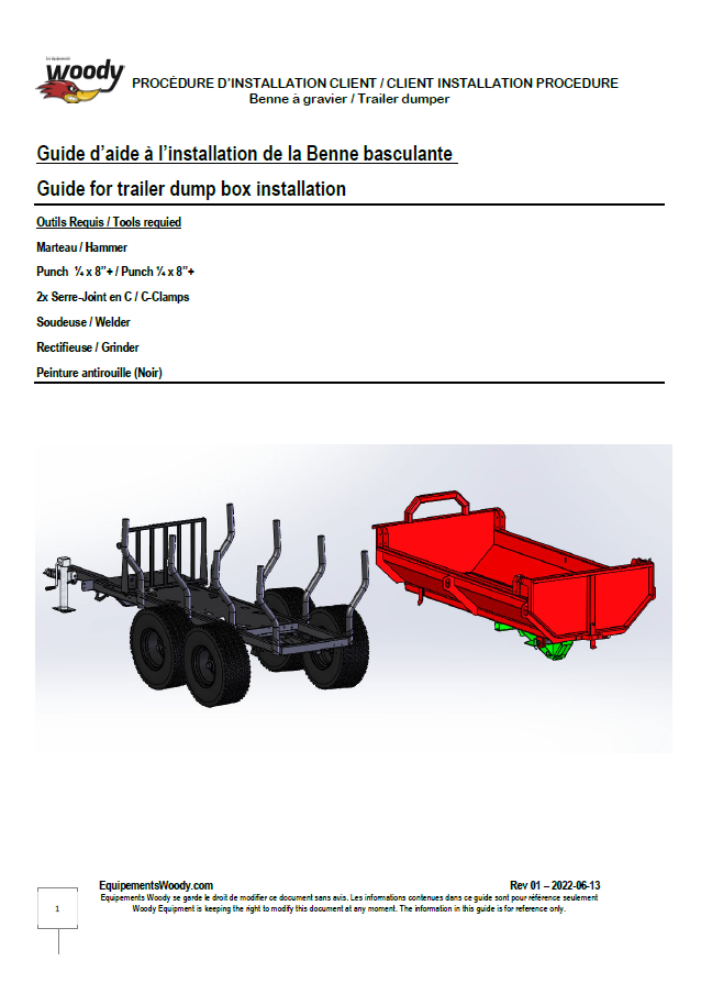Les boîtes basculentes pourrait ne pas être compatible avec nos remorques produite avant 2022. SVP Valider avec votre représentant, le numéro de série de la remorque. L'installation en usine est recommandé pour ce type de produit. Équipements Woody n'est pas responsable de la non compatibilité lorsque non installé en usine.