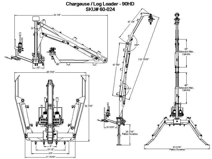 La 90-HD est conçue pour les VTT de 400 cc et plus, ainsi que pour les tracteurs de petite taille. Son bas profil de 63" est idéal pour les travaux dans les érablières, vous pourrez passer sous vos tubes à plusieurs endroits sans les démonter. Sa portée est de 9' et sa capacité de levage à portée maximale est de 600 lb. La 90-HD comprend sa propre unité hydraulique; vous n'avez donc pas besoin de sortie d'huile auxiliaire.
